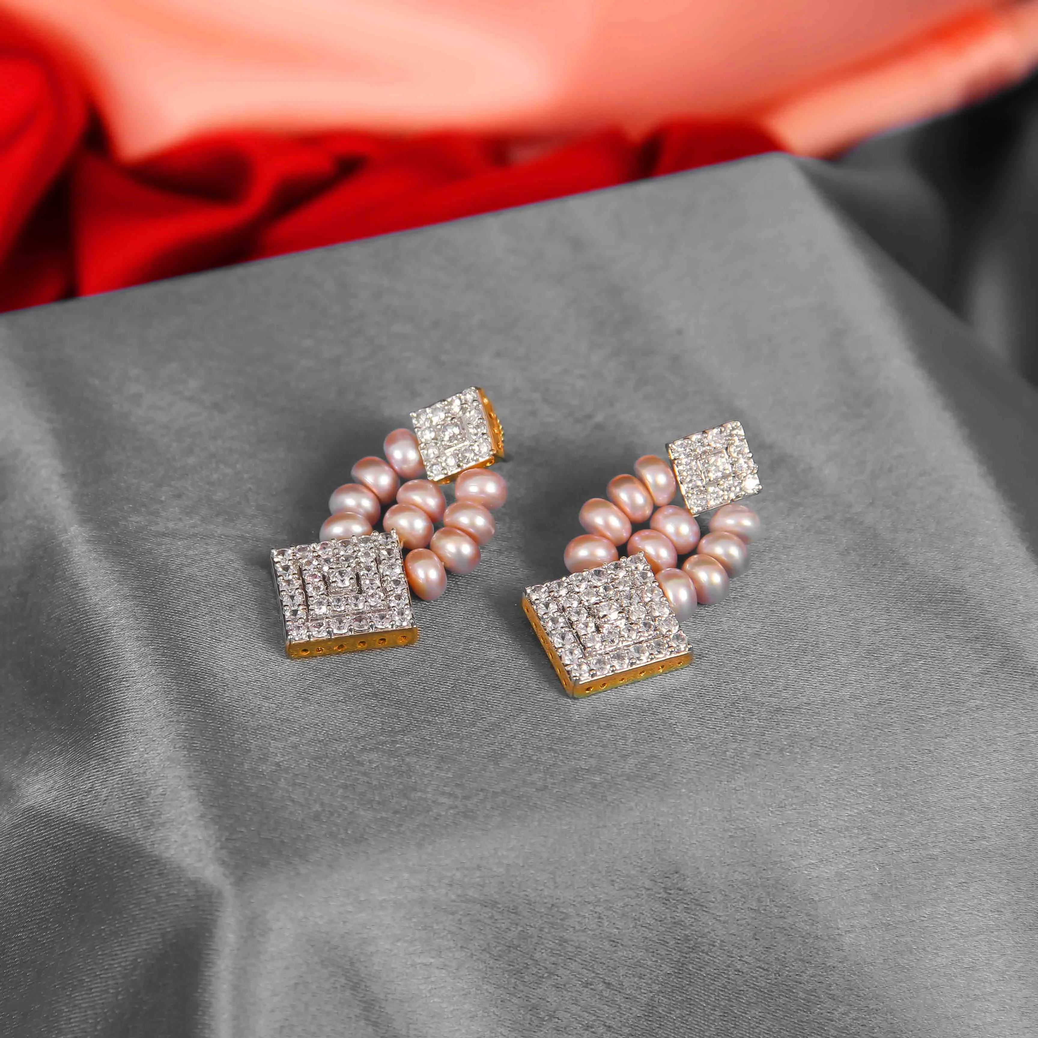 Elegant three-strand rose-peach imitation pearl necklace set featuring three graduated strands of lustrous pearls, gold-tone spacers and square cubic zirconia accents. Includes matching drop earrings. Ideal for weddings, receptions and festive wear. Handcrafted finish, lightweight and comfortable for prolonged wear.