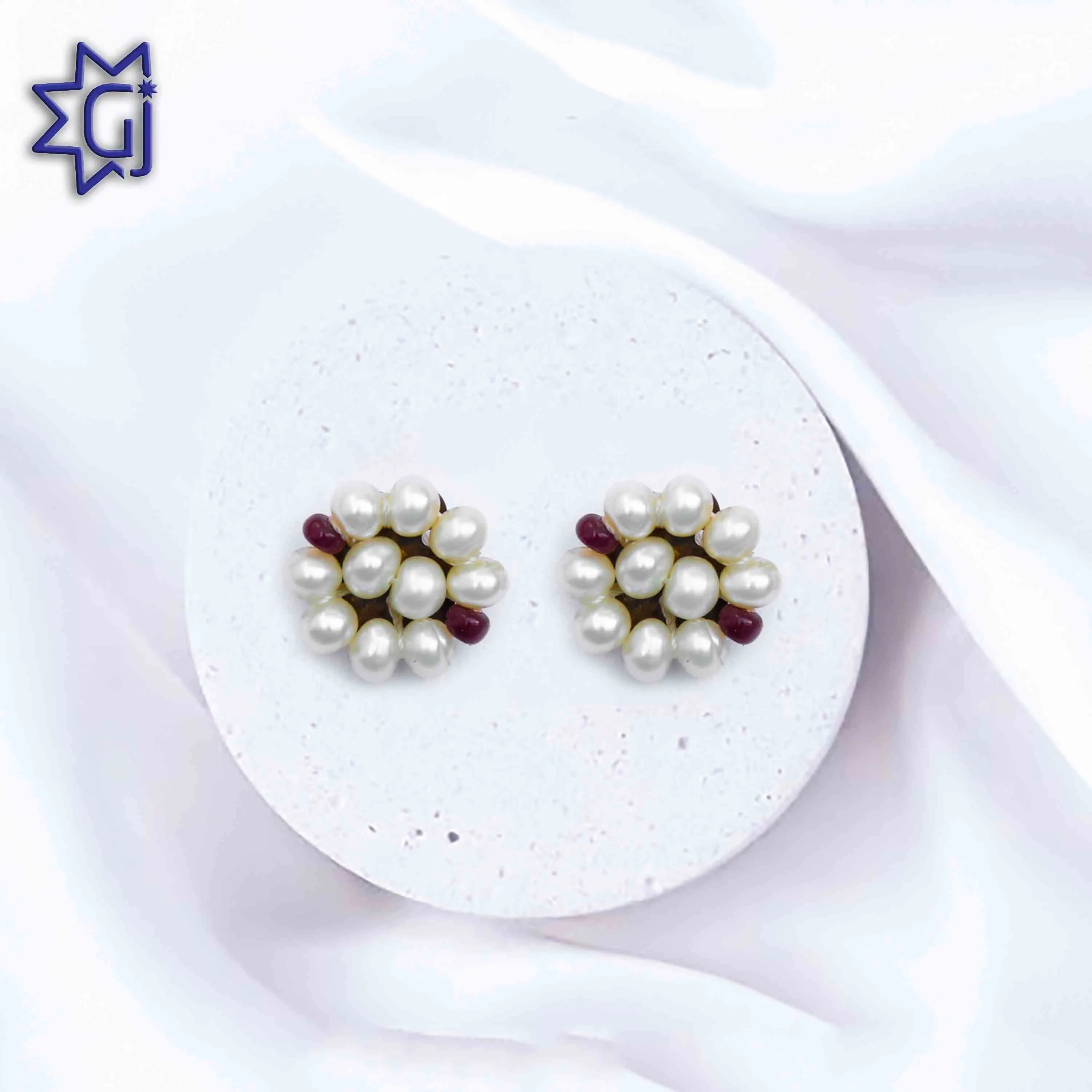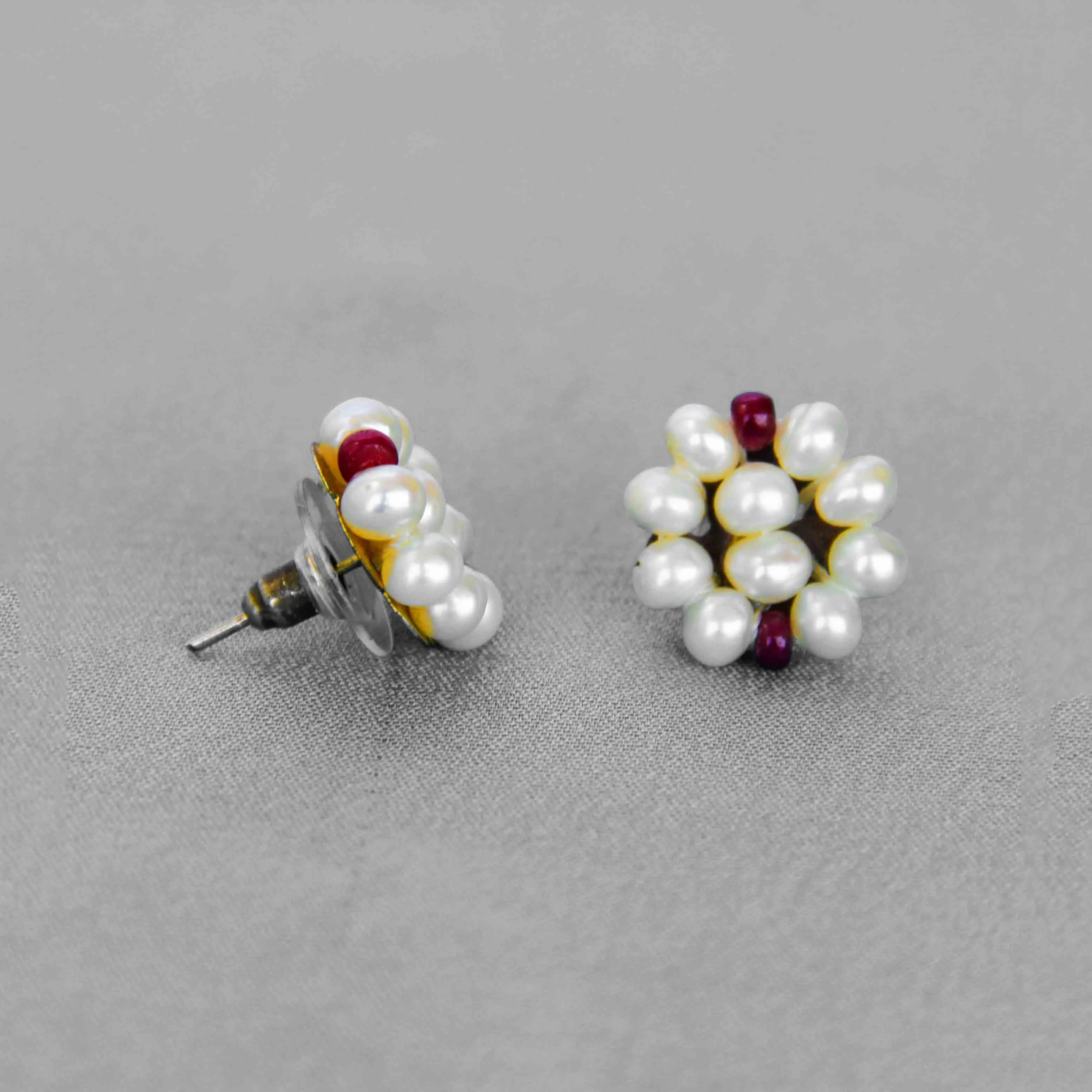 These pearl stud earrings feature round imitation pearls with a subtle gold-tone base, accentuated by deep ruby stones placed on either side. The perfect balance of elegance and everyday wearability.